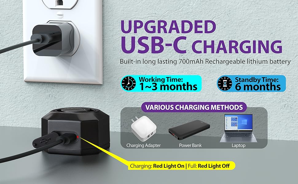 Alcance del mando a distancia: de 50 a 70 metros. Funciona con pilas, ya están incluidas. Duración de la batería, de 1 a 3 meses en funcionamiento. Si no se usa mas de 6 meses. Carga mediante cable USB-C.